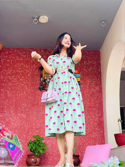 Soft Green Collar Block Print Dress