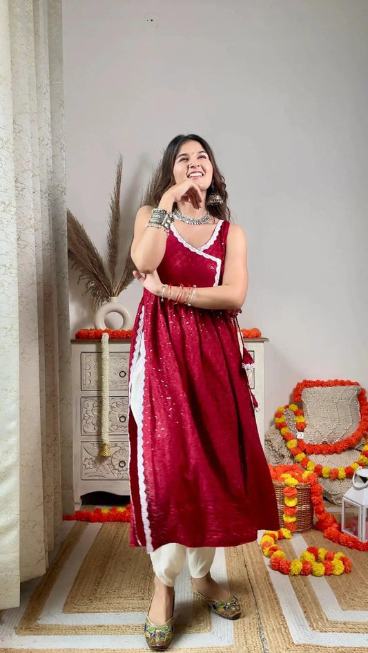 Swati's Rose Maroon Angrakha Gulnaz Kurta