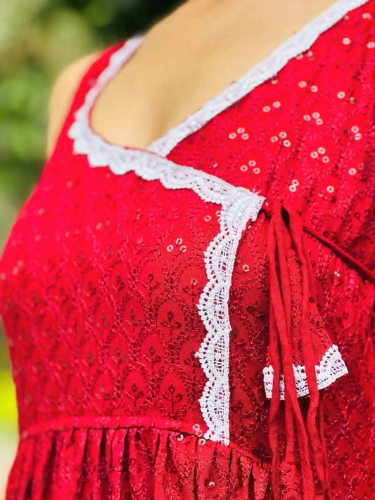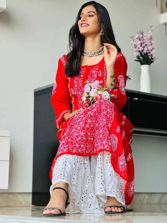 Scarlet Red Meher Chikan Embroidered Anarkali