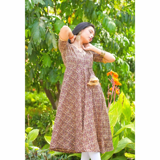 Jaipuri Handprinted Brown Gulnaz Twirl Anarkali