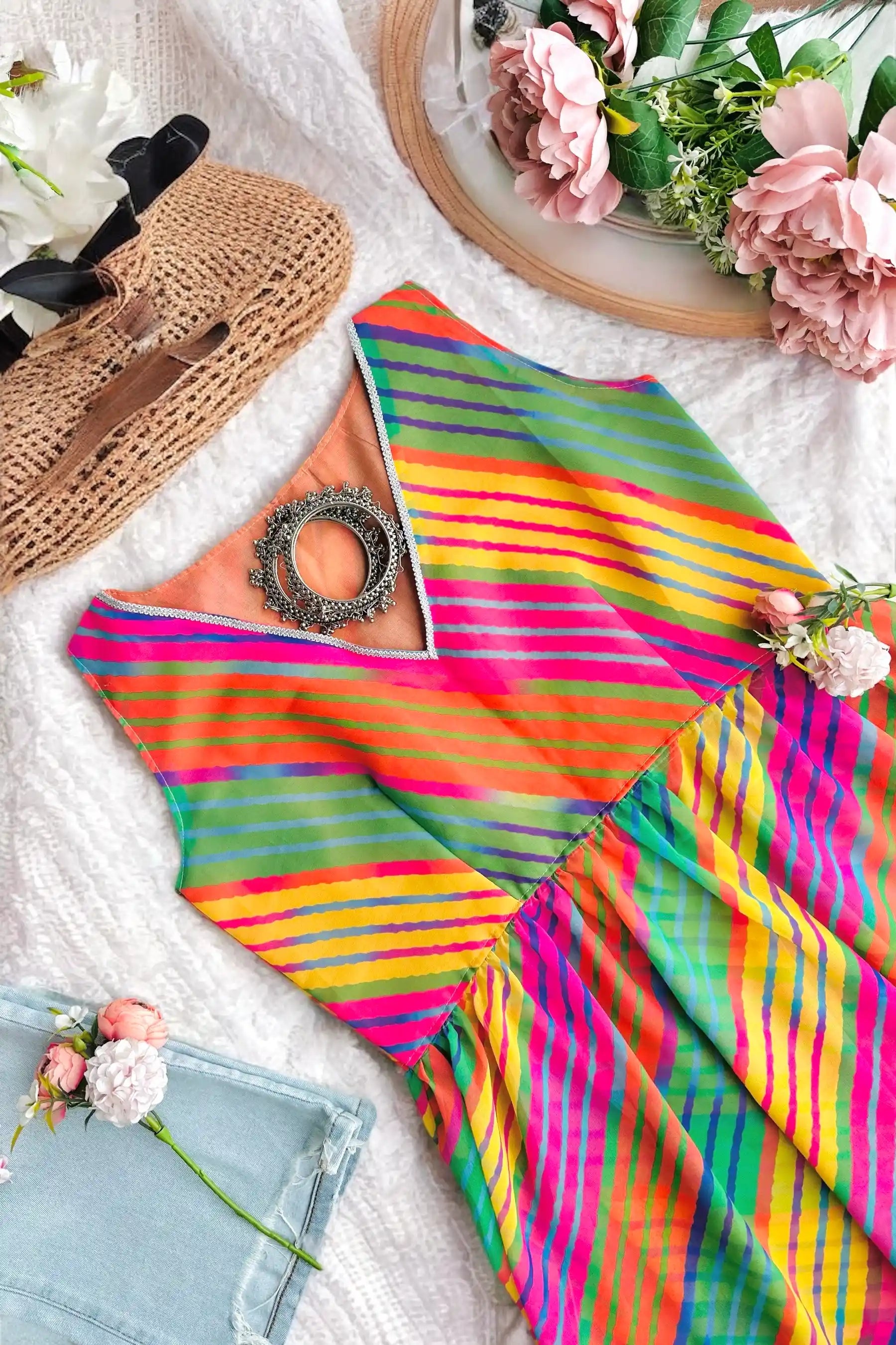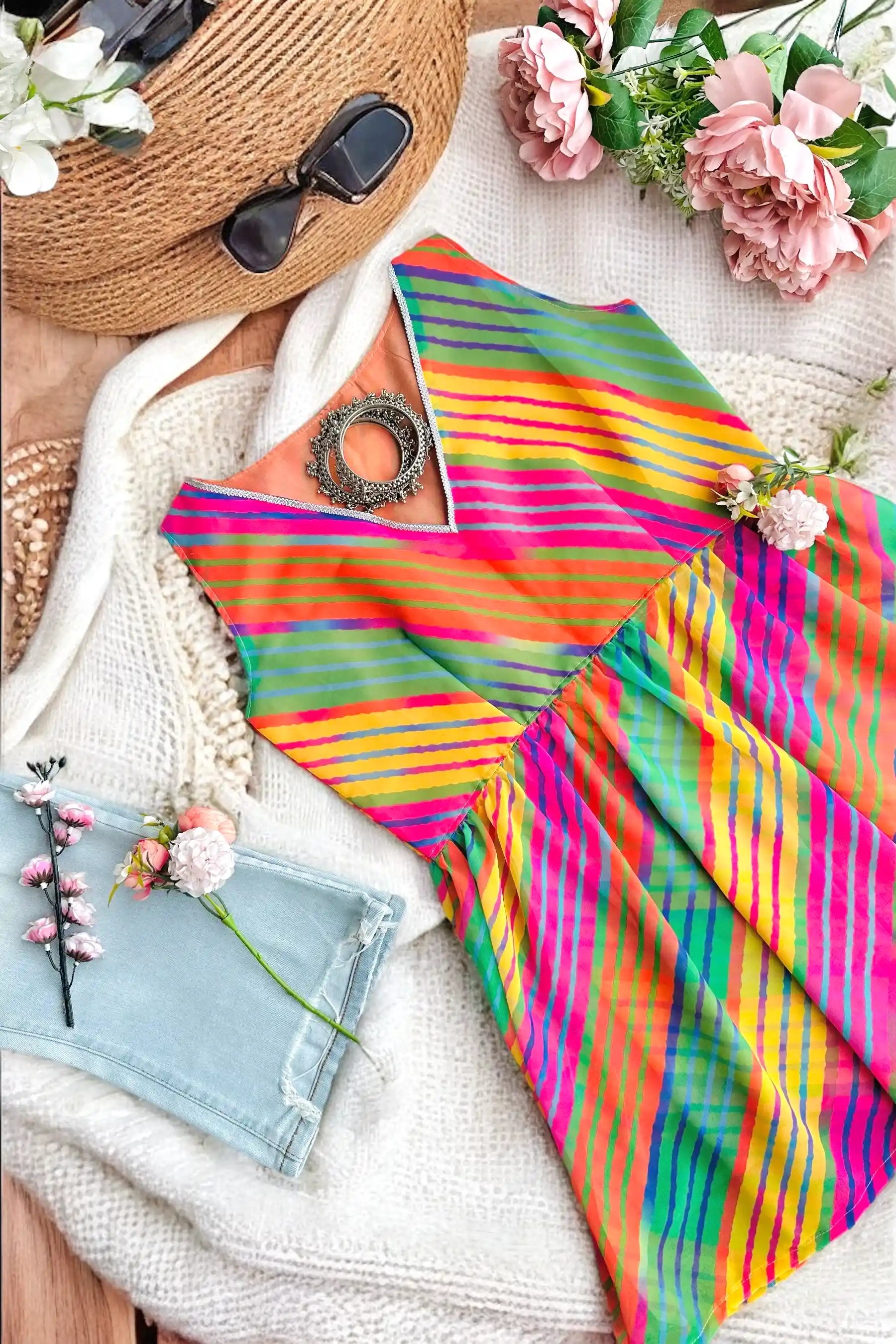 Step into the season with vibrant charm in our Blush Lehriya Gulnaz Peplum. Designed with playful multicolored diagonal stripes, this sleeveless piece is a burst of joy and energy, perfect for festive days or casual outings. Its flattering V-neckline and breezy silhouette bring effortless comfort while making sure you stand out in style. Pair it with denim, leggings, or statement jewelry for a chic, lively look.