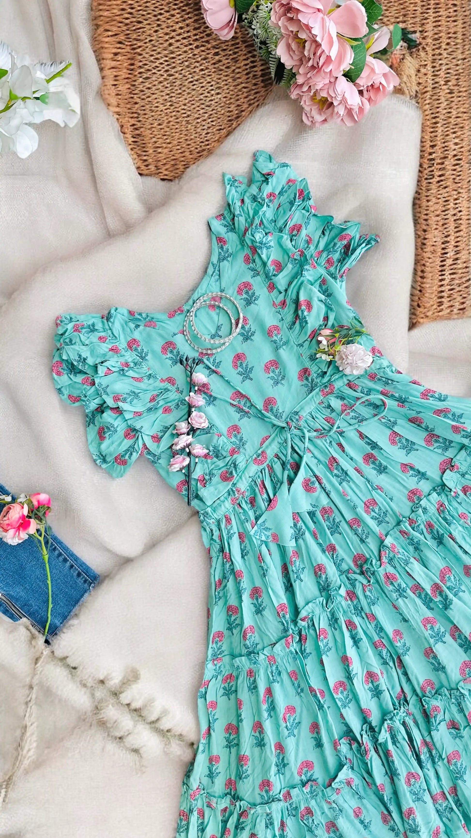 It's easy, breezy and just the right choice for this season. The breathable glace cotton fabric is tailored into a chic high-cut kurta. The frilled sleeves extend to the bodice, complimenting the layered ruffles of the kurta.