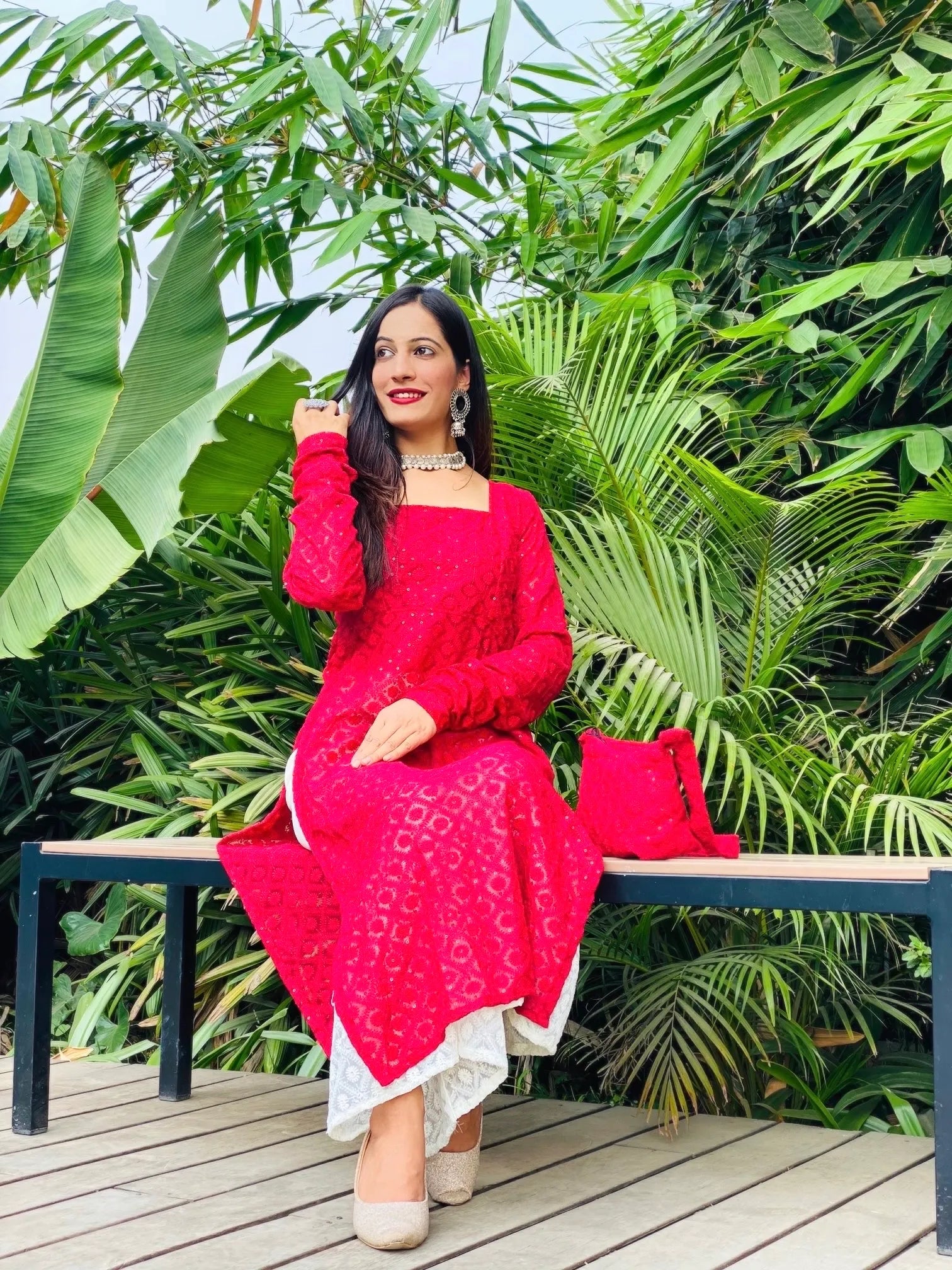 Indulge in the serenity of our Desert Maroon Embroidered Gulnaz Kurta. Crafted from soothing maroon georgette fabric, this ensemble exudes grace and tranquillity. This outfit offers a perfect blend of elegance and comfort, making it ideal for festive occasions.