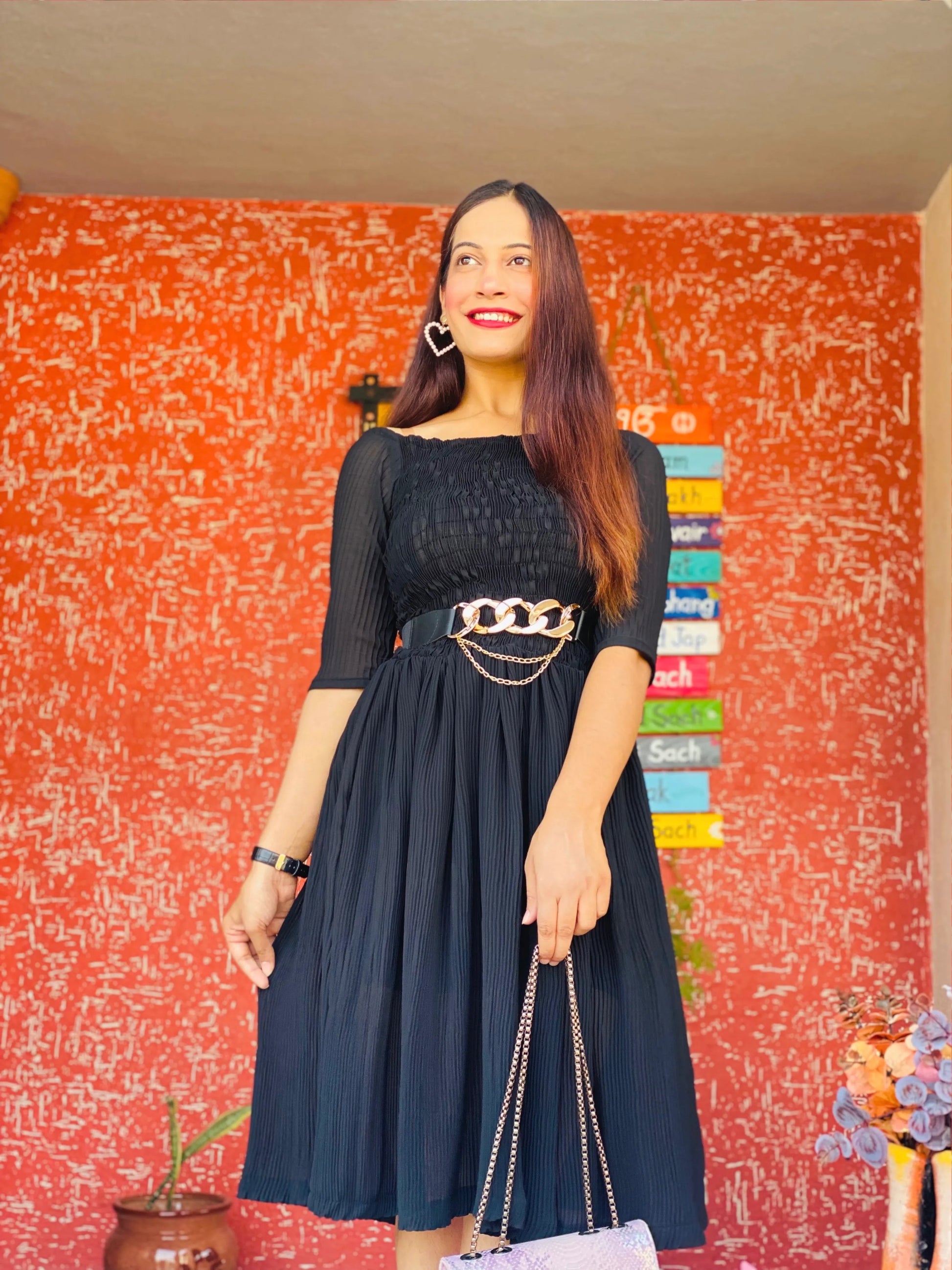 Introducing our Dusky Black Smoky Crepe Twirl Dress. This elegant dress combines comfort and style, with a flattering fit and lightweight fabric. The adjustable fit add a playful touch to the look. It's versatile for various occasions, from casual to formal. Pair it up with heels and accessories for a chic look or dress it down with sandals and a denim jacket.