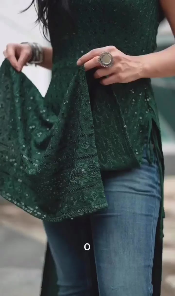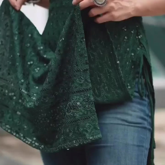Indulge in the luxurious comfort of Our most loved Rajvee’s Emerald Green Sequence Gulnaz Kurta crafted from the finest glace cotton fabric that feels as gentle as a daydream against your skin.