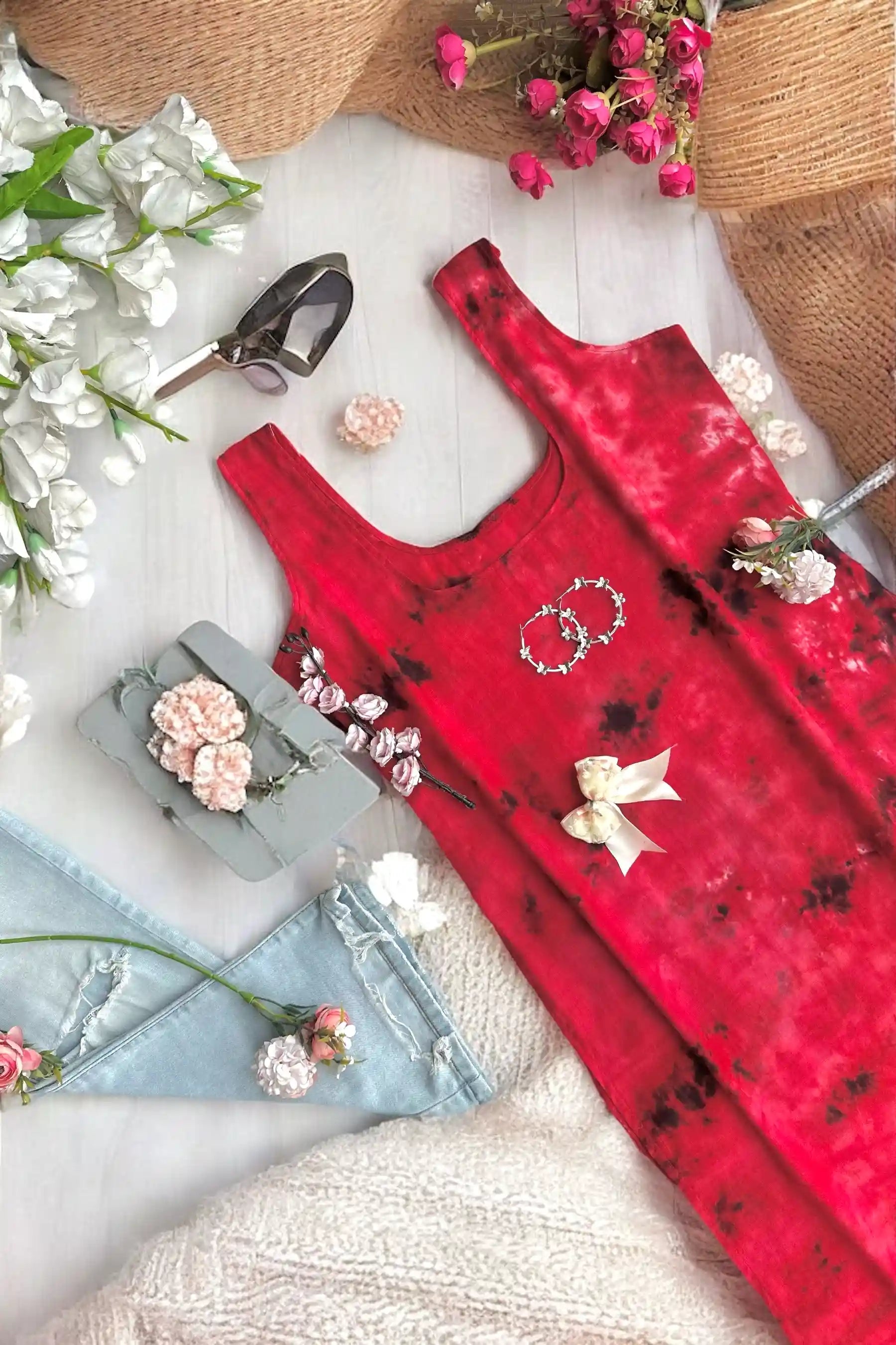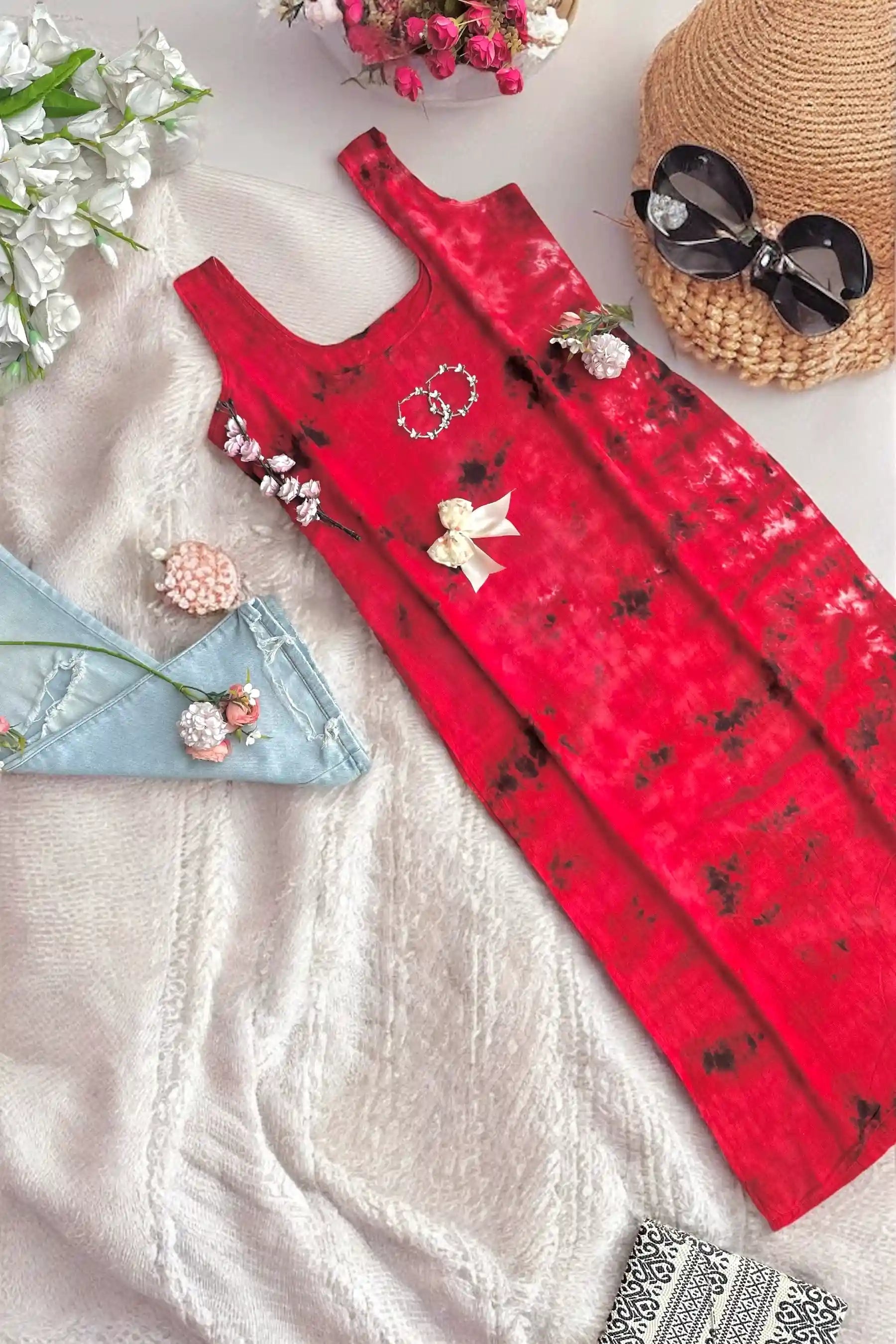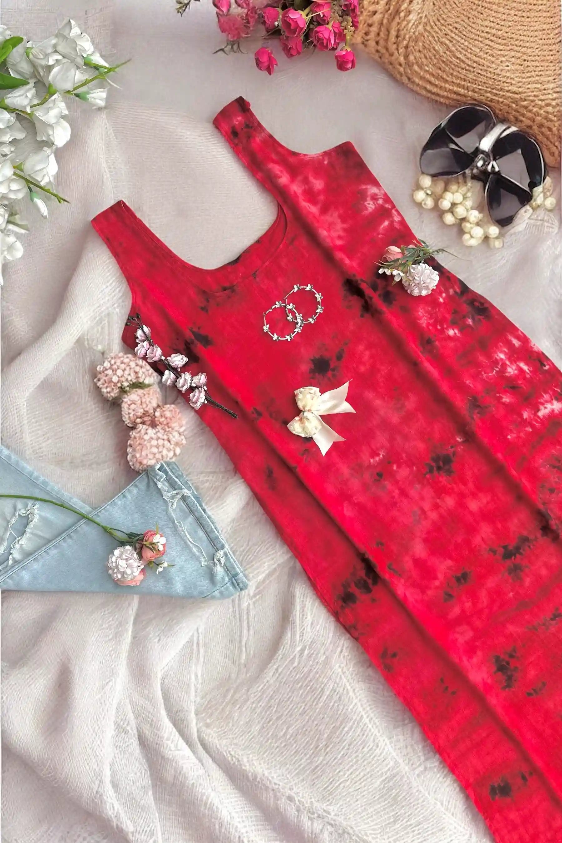 Add a pop of bold elegance to your wardrobe with our Tie-Dye Kurta, featuring a striking red and black tie-dye base with subtle grey undertones. Its sleeveless silhouette is perfect for warm days, while delicate embellishments and floral accents lend a touch of femininity. Style it with distressed denim or palazzos for a vibrant, effortless look.